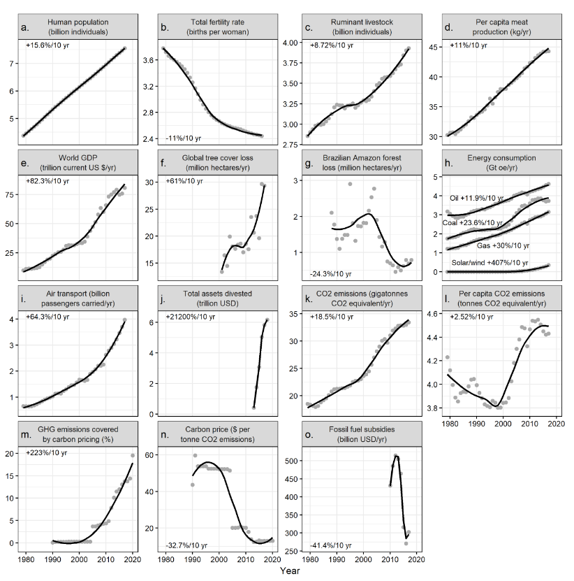 Rapidement, que voyons-nous ? La population humaine augmente (a) mais la fertilité baisse (beaucoup, b), le nombre de bêtes destinées à la consommation de viande augmente (c, d), la croissance se porte bien (e), la déforestation augmente extrêmement rapidement (f), la disparition de la forêt amazonienne qui avait tendance à baisser repart à la hausse depuis Bolsonaro (g), les consommations d’énergie augmentent (h), tout comme le trafique aérien (i) ou le CO2 (k); bref, je ne vais pas m’attarder sur les courbes représentant l’économie du carbone que je ne comprends pas bien et dont l’intérêt profond m’échappe.