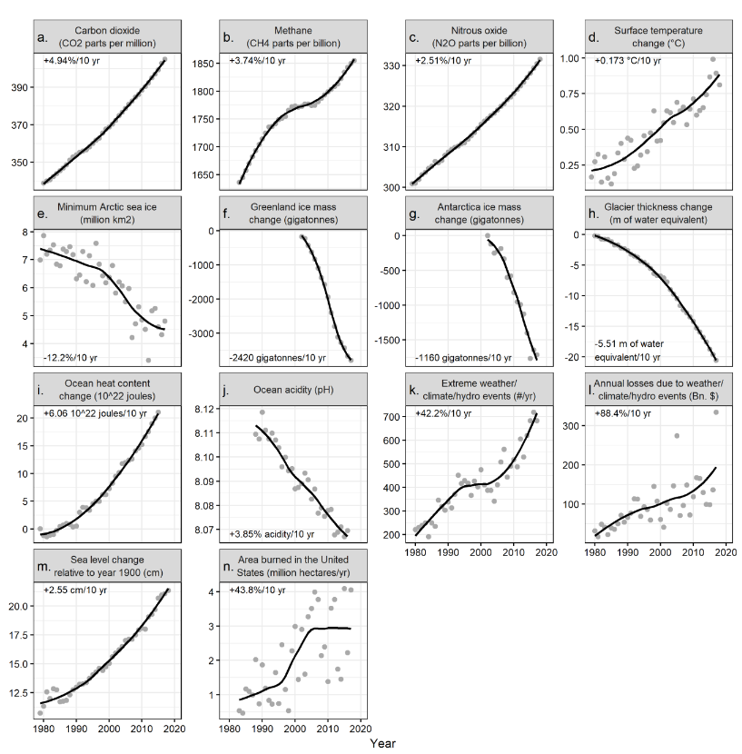 Un autre tableau cette fois plus axé sur les impacts et mesures du changement climatique en passant par la température, la fonte des glaciers, l’acidification des océans, les événements climatiques extrêmes etc. La prochaine fois que vous voyez un climato-sceptique, vous avez au moins de quoi lui fournir des données 🙂