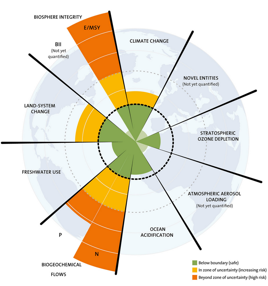 Néanmoins, vous pouvez remarquer que le changement climatique n’est a priori pas le pire problème auquel nous devons faire face : l’intégrité de la biosphère (qui inclue en gros le fonctionnement normal des écosystèmes et la biodiversité), les cycles des nutriments utilisés principalement en agriculture (surtout l’azote N et le phosphore P), ou bien la destruction et/ou le changement d’utilisation des terres naturels, semblent être des problématiques encore plus graves, comme quoi !