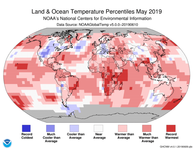 Nous parlons beaucoup du réchauffement climatique dans les médias, et tant mieux, même si ce qui est raconté n’est pas toujours exact. En effet, on confond encore beaucoup la météo et le climat : ce n’est pas parce qu’il fait froid à un endroit donné que le climat de la planète entière se refroidit, et inversement. Par exemple, nous avons eu en France un printemps plutôt froid, pourtant, à l’échelle de la planète, il a fait plus chaud que d’habitude comme le montre l’image ci-dessous : on voit qu’il a fait plus froid que d’habitude en Europe (carrés bleus clairs) alors qu’en moyenne, dans le reste du monde, on voit largement une dominance de carrés rouges (plus chaud que la normal) voire rouges foncés (records absolus de chaleur).