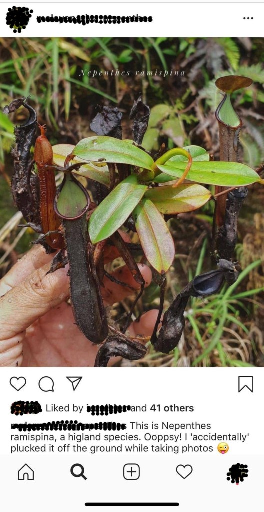 Enfin, les plantes carnivores sont aussi menacées car leur beauté et leurs caractéristiques uniques suscitent une collecte abondante d’individus sauvages. En effet, le braconnage est une menace non négligeable, d’autant plus pour des espèces nouvellement découvertes ou rares pour lesquelles les collectionneurs sont prêts à débourser une somme d’argent colossale afin de les acquérir. Les auteurs de l’article précisent qu’ils reçoivent systématiquement des messages leur demandant des précisions sur les localités d’individus photographiés, et qu’il n’est pas rare de trouver des « trous » dans des zones où pouss(ai)ent des plantes carnivores. Le genre Sarracenia est particulièrement touché par le braconnage (avec des disparitions d’individus répertoriées quelques jours seulement après la publication de photos sur les réseaux sociaux), tout comme la dionée et le Cephalotus follicularis pour lequel des populations entières ont été illégalement prélevées. La dernière population connue de Nepenthes clipeata a par exemple été braconnée très récemment et même si les auteurs ont pu être interpellés grâce au travail formidable des associations locales, on ne sait pas a priori si les plantes pourront être replantées (elles sont pour le moment cultivées sous la surveillance des autorités).