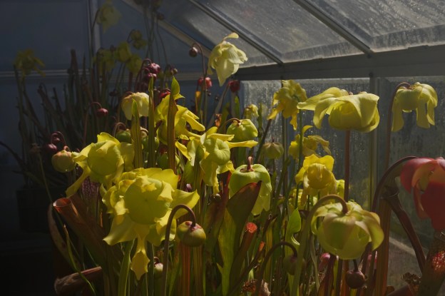 Idem avec un hybride H50 x FRT08 = (S. purpurea Québec x oreophila) x S. flava var rubricorpora (SF68 Aidan, SFRB09 Cédric). J’ai l’impression que la couleur de la fleur n’est pas un argument parfaitement valable pour identifier les hybrides de Sarracenia et que la dominance d’une couleur ne veut pas forcément dire que le ou les parents avec la même couleur de fleur est majoritaire.