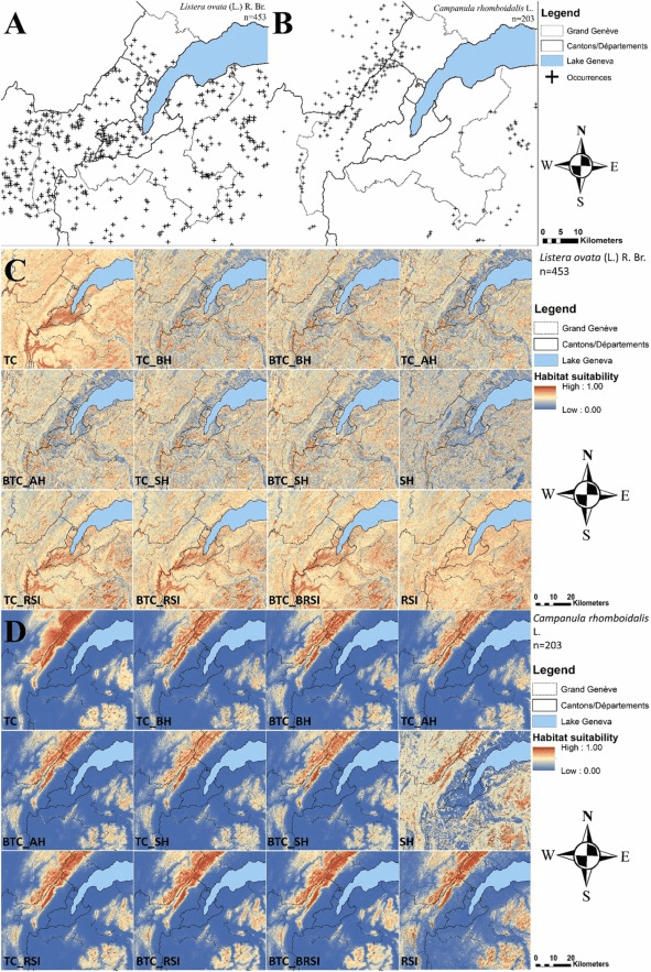 On voit ici la localisation des individus et les différentes distributions modélisées pour deux espèces : Listera ovata (A,C) et Campanula rhomboidalis (B,D)