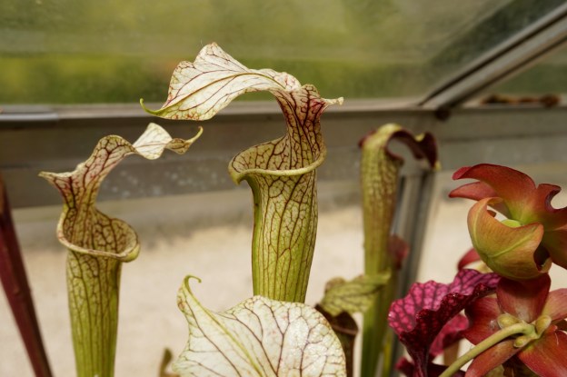 HP2017E – Sarracenia x readii (rubra subsp gulfensis « areolated » x leucophylla « green »). Un joli clone aux formes inhabituelles