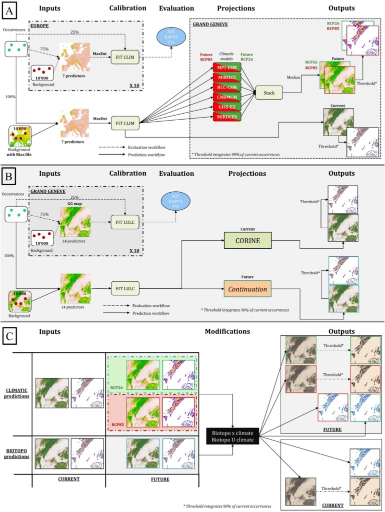 En résumé, nous avons collecté plus de 22 millions d’observations précises de plantes à l’échelle de toute l’Europe pour environ 1700 espèces présentes dans le Grand Genève (territoire transfrontalier entre la France et la Suisse), et nous avons modélisé leur distribution pour la situation présente, ainsi qu’en 2050 dans des scénarios optimistes de changement climatique et dans des scénarios pessimistes. Pour les distributions futures, nous avons aussi pris en compte les changements d’utilisation des sols qui ont été modélisés exprès pour cet exercice (je vous reparlerai prochainement de cette méthode et de son utilité).