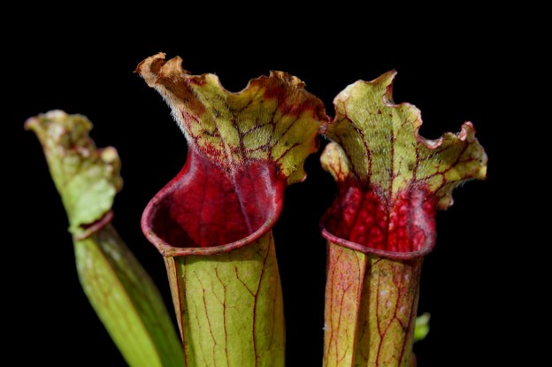 - Déterminer la parenté exacte de cet hybride est difficile car je n’ai effectué aucun suivi. Cette plante a en effet poussé dans un bac depuis de nombreuses années sans que je n’y prête attention, jusqu’à l’année dernière quand j’ai remarqué ses motifs de coloration particuliers. Néanmoins, il a tout l’air d’être issu d’une autopollinisation de Sarracenia x mitcheliana. La plante est robuste et pousse vigoureusement.
