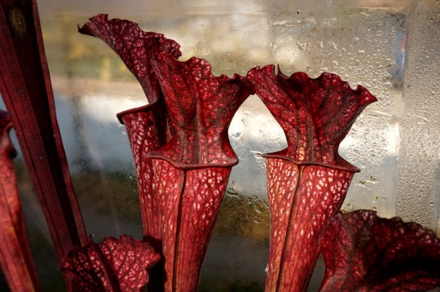 - A l’ouverture, les pièges sont verts veinés de rouge. Mais, si la luminosité est suffisante, ils se colorent vivement d’un rouge plus ou moins intense au mois de Décembre comme le montre les photos ci-dessous. Les pièges restent bien vivants jusqu’au milieu de l’hiver, c’est un plaisir assez exceptionnel en cette saison ! La fleur est d’un rouge vif somptueux.