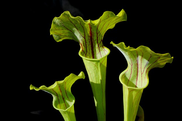 - Plante aux pièges glabres, robustes, verts, veinés de rouge dépassant rarement 50cm de hauteur. La fleur, plus haute que les pièges, est jaune pâle et semble stérile, je n’ai en effet jamais réussi à avoir des graines. L’opercule est rond, ondulé et terminé par un éperon enroulé sur lui-même. La croissance est normale et la division assez rapide. La plante produit de petits phyllodes plaqués au sol l’hiver. En été, elle forme une touffe assez compacte du plus bel effet.